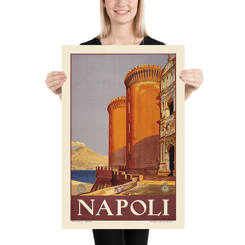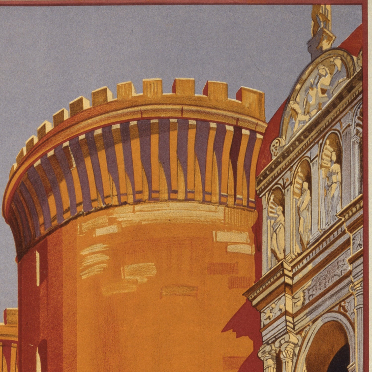 Why this subject matters: Naples is one of Europe’s great historic ports, a gateway to the Amalfi Coast and the islands of the Tyrrhenian Sea. Its medieval towers and seafront ramparts symbolize centuries of maritime power and cultural exchange. Around 1920, improved rail links and steamship routes fueled a boom in leisure travel; posters like this were Italy’s vibrant invitation to explore the city’s palaces, piazzas, and waterfront promenades.