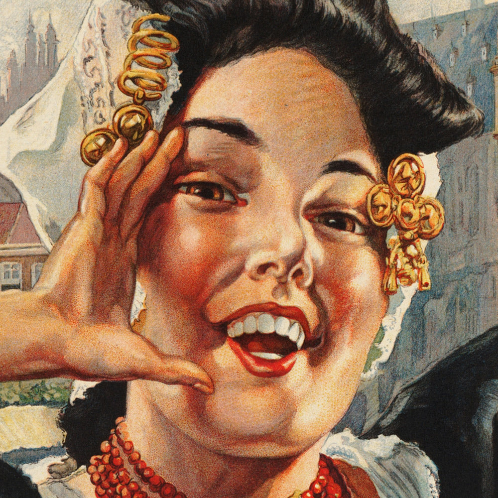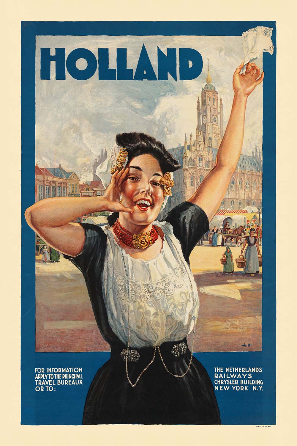 Holland by an unknown poster artist is a joyous slice of early 20th-century travel art, inviting viewers to discover the Netherlands through the charm of traditional culture. Created in the golden age of European tourism, the design pairs an exuberant figure in regional dress with a dignified architectural backdrop, capturing the romance and optimism that fueled journeys across the continent. “Holland” here evokes the spirit of the Dutch coastal provinces and, by extension, the wider Netherlands—an alluring shorthand that travel bureaus and railways often used to entice visitors.