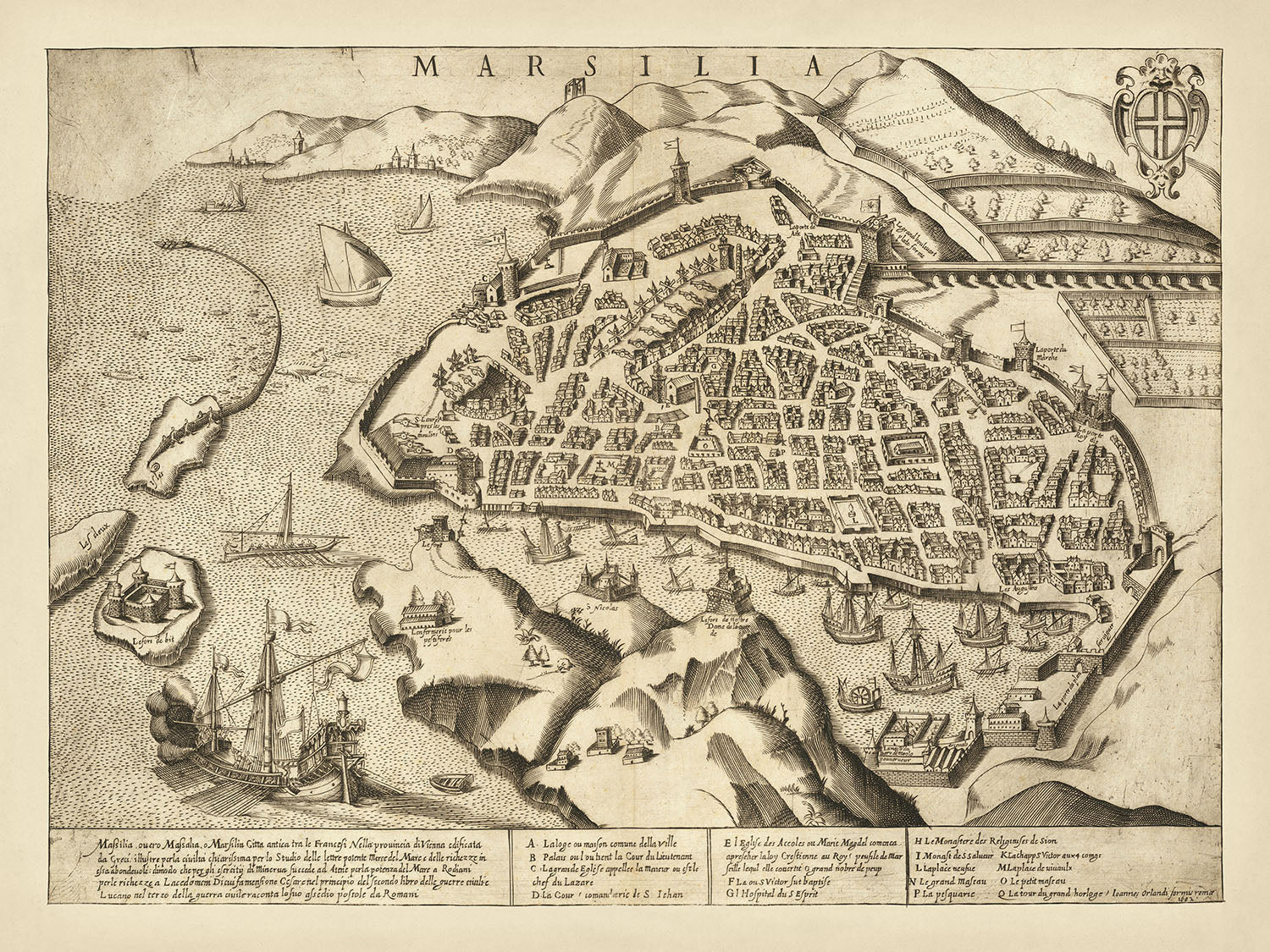 Plan ancien de Marseille par Orlandi, 1580: Notre Dame, La Major, Saint Laurent, Port, Arsenal