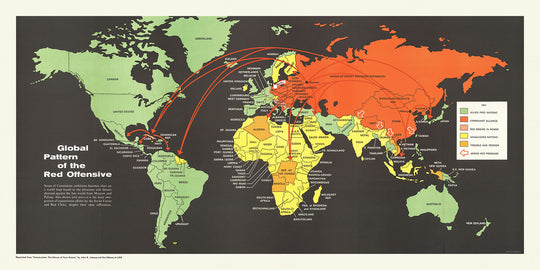 Le design de la carte est à la fois frappant et évocateur, avec une légende codée par couleur qui distingue clairement entre les nations libres alliées, les alliances communistes, les régimes rouges au pouvoir et les nations non alignées. L'utilisation de flèches rouges et blanches pour indiquer l'agression communiste et les zones de conflit ouvert, respectivement, ajoute un élément visuel dynamique qui souligne la menace perçue de l'expansion communiste. L'absence de caractéristiques géographiques et topographiques concentre l'attention du spectateur uniquement sur le paysage politique, faisant de la carte un outil puissant pour transmettre l'urgence et la gravité de la situation mondiale en 1961.