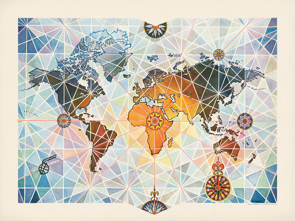 Le design de la carte est un chef-d'œuvre d'art géométrique, avec un réseau de lignes intersectées qui suggèrent les itinéraires de vol d'Air Afrique. Ces lignes sont complétées par des roses des vents ornées, ajoutant une touche d'élégance et de direction à la composition. Les couleurs vives et les motifs complexes créent un sens du mouvement et de la connectivité, incarnant la mission de la compagnie aérienne de relier les continents et les cultures. Cette carte est plus qu'un outil de navigation ; c'est une célébration de l'esprit d'exploration et d'unité.
