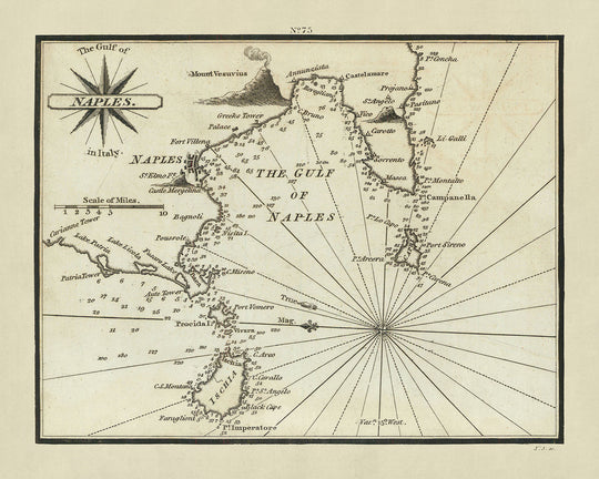 Au-delà de son utilité pour les marins de son époque, la carte sert de snapshot historique, capturant les détails complexes de la vie côtière et insulaire. Elle inclut la ville animée de Naples, les îles sereines de Capri et d'Ischia, et les pittoresques villes parsemant la péninsule de Sorrente. À noter, les représentations de sites anciens et médiévaux, comme les ruines de Pompéi et le Castel dell'Ovo, offrant un aperçu du riche passé de la région. L'inclusion d'une échelle et d'une rose des vents renforce encore sa valeur, fournissant des informations sur l'utilisation pratique de la carte à l'époque de Heather.