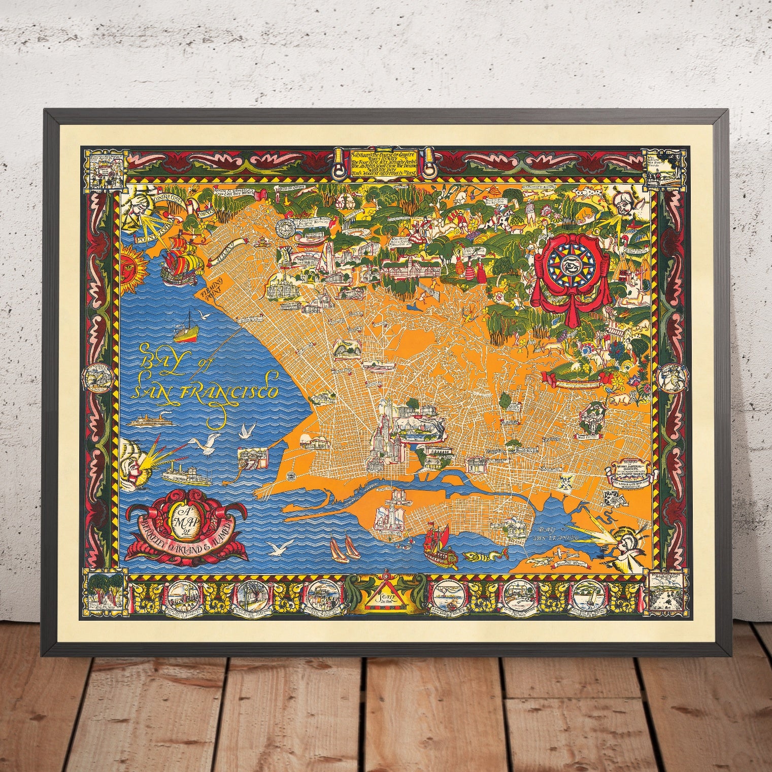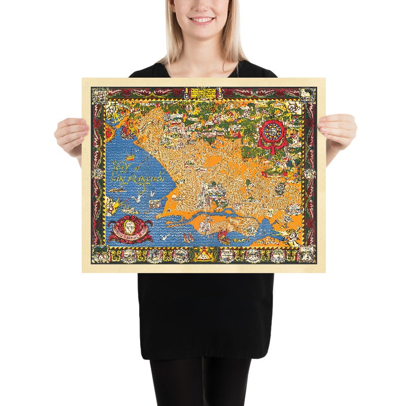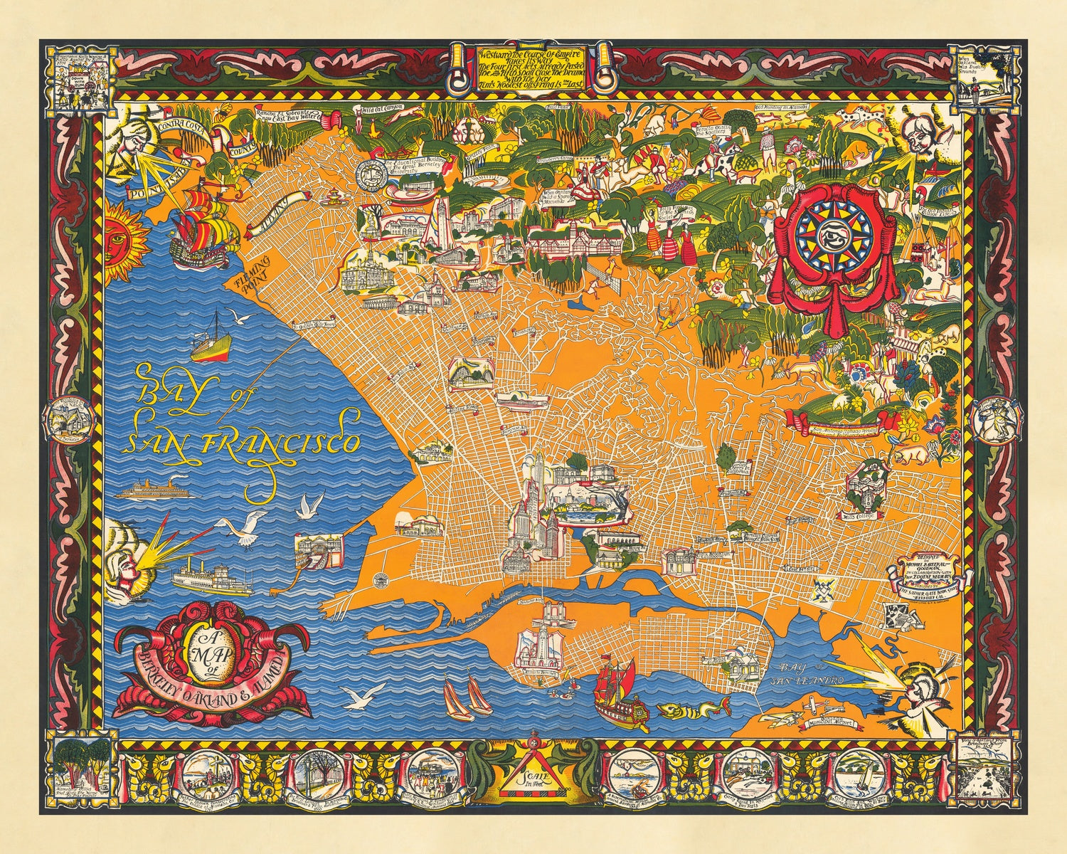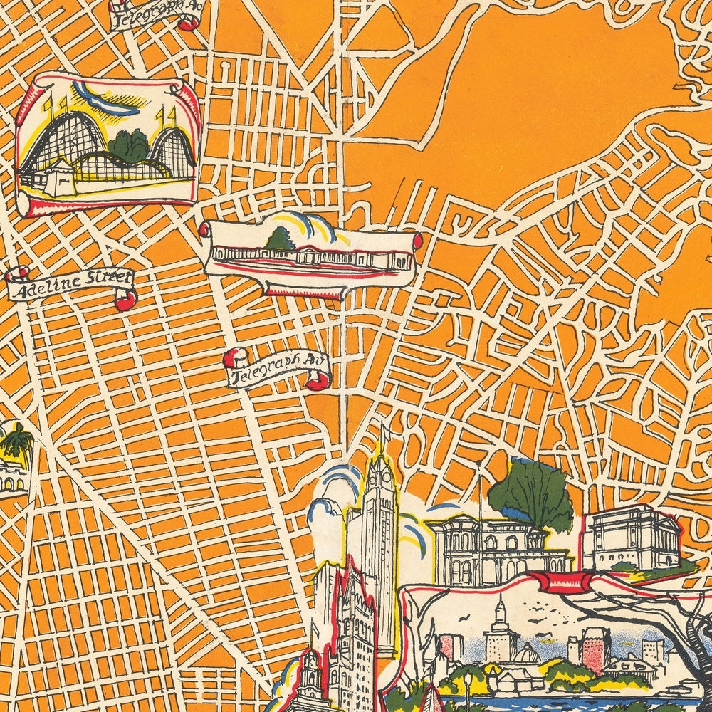 A Map of Berkeley, Oakland & Alameda, created in 1930 by Eugene Neuhaus in collaboration with Michael Baltekal Goodman, is an Art Deco city portrait that fuses orientation with romance. A spare, lucid street lattice occupies the center, while saturated color drenches the Bay, the hills, and the margins where stories reside. Wind cherubs breathe over the Estuary as a capering sea creature keeps watch offshore. Across the blue, ancient galleons and sleek ferries share water with modern steamers. Elevations of landmark buildings punctuate neighborhoods, and small vignettes recount seminal episodes in East Bay history. As a city map, it is notable for uniting three distinct municipalities into one legible organism and for balancing the grid—Shattuck, Telegraph, Grand—with narrative pleasures and quotations celebrating the region’s verve.