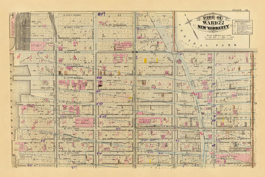 Le quartier 22 de la ville de New York, tel que représenté sur cette carte, comprend des monuments remarquables tels que l'hôpital Roosevelt et l'église catholique Saint-Paul. La carte s'étend à des parties de Central Park, l'un des espaces publics les plus emblématiques au monde. L'hôpital et l'église sont des monuments non seulement pour leur valeur historique, mais aussi pour leur importance continue dans le paysage de la ville. L'hôpital Roosevelt, ouvert en 1871, était à l'époque une institution essentielle en matière de soins de santé, et l'église catholique Saint-Paul était un centre spirituel important pour la communauté.
