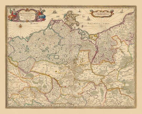 Cette magnifique carte, intitulée « Electoratus Brandenburgi, Mekelenburgi, Et maximae Partis Pomeraniae novissima Tabula », témoigne de la maîtrise cartographique de Nicolaes Visscher II, un cartographe renommé du Siècle d'or néerlandais. Traduit en anglais, le titre se lit comme suit : « La carte la plus récente de l'électorat de Brandebourg, du Mecklembourg et de la plus grande partie de la Poméranie ». Ce morceau d'histoire complexe offre une vue détaillée du paysage politique et géographique de la fin du XVIIe siècle, en se concentrant spécifiquement sur l'électorat de Brandebourg, une région historique importante de l'Allemagne moderne.