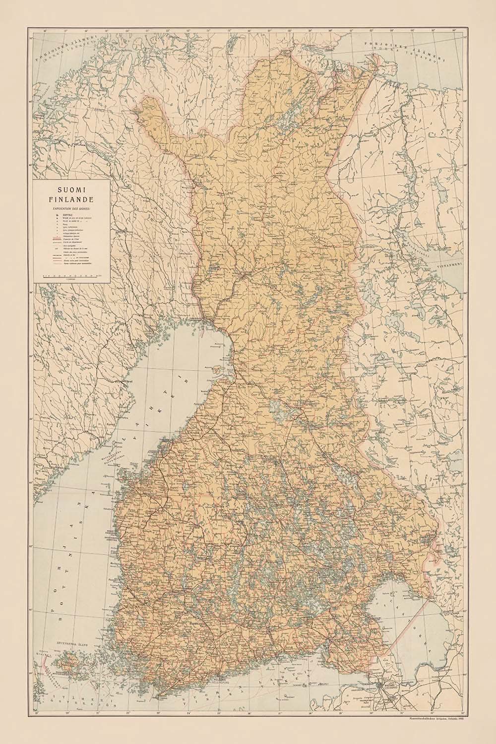 La carte détaille en détail les frontières de la Finlande avec la Suède, la Norvège et la Russie voisines, offrant un aperçu de la dynamique politique complexe de l'époque. Les vastes réseaux routiers et ferroviaires représentés sur la carte illustrent l'infrastructure florissante de l'époque, offrant un aperçu du développement économique et social de la Finlande. Ces éléments font de la carte une ressource précieuse pour les historiens et les passionnés, désireux d'explorer l'interdépendance de la géographie et de l'histoire.