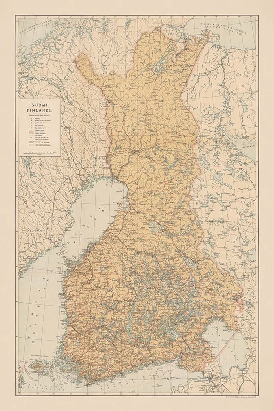 Outre son importance géographique et historique, la carte offre une exploration fascinante des centres urbains de la Finlande. Des villes comme Helsinki, Tampere et Turku y sont mises en évidence, chacune avec sa propre histoire et sa contribution à la riche mosaïque de la Finlande. La carte est un artefact intemporel, capturant l'essence d'une nation à l'aube de la modernité, tout en honorant ses traditions profondément enracinées et sa splendeur naturelle.