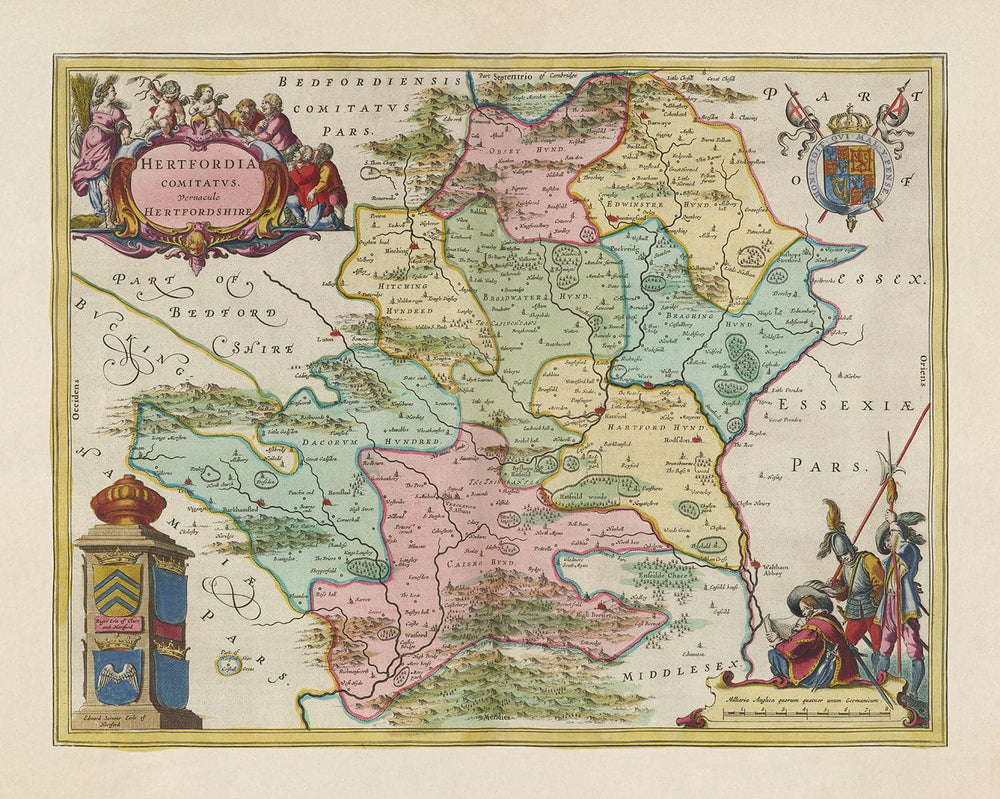 Ancienne carte du Hertfordshire, 1665 par Blaeu: Stevenage, St Albans, Watford, Enfield, Barnet, Hatfield, Hemel Hempstead
