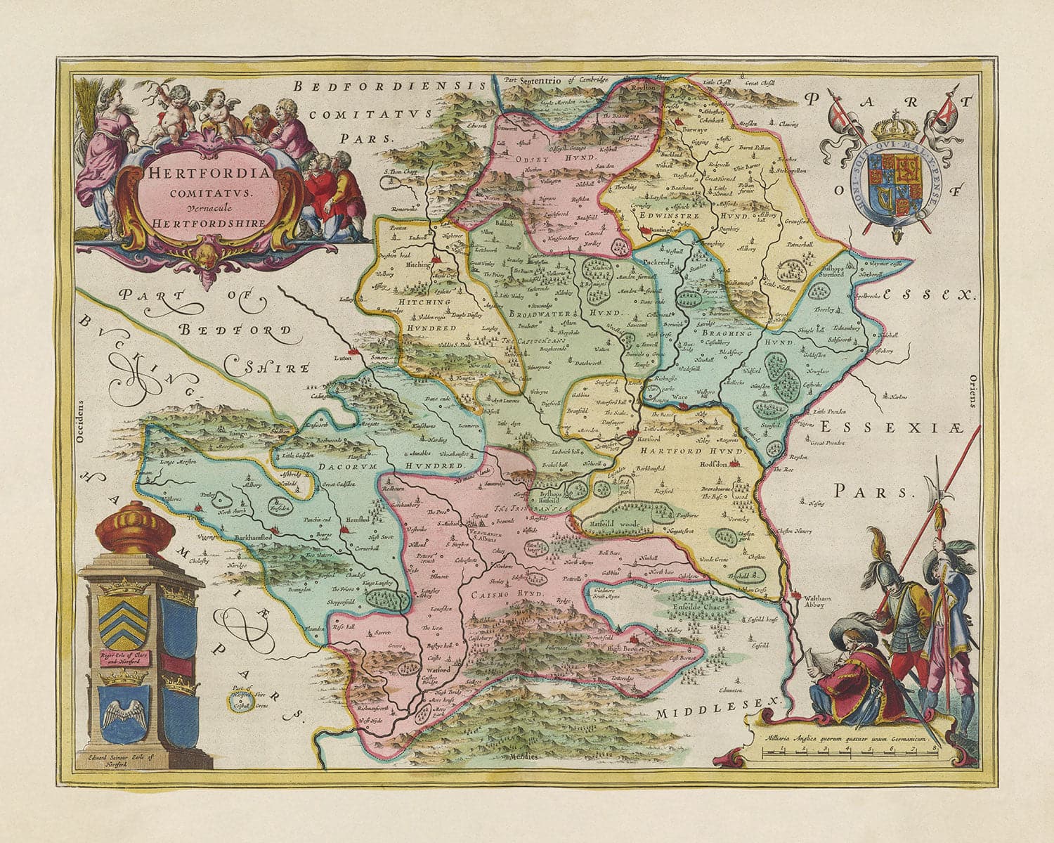De nombreuses villes, villages et cités du Hertfordshire sont déjà visibles sur cette ancienne carte, comme Hertford, Watford et St Albans.