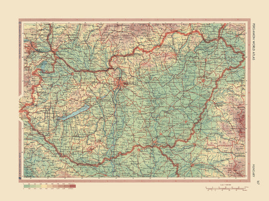 Dans l'ensemble, cette carte est un document historique précieux qui fournit une représentation détaillée et précise de la Hongrie en 1967. Sa couverture complète des caractéristiques politiques et physiques en fait une ressource essentielle pour toute personne intéressée par l'histoire et la géographie de ce pays fascinant.
