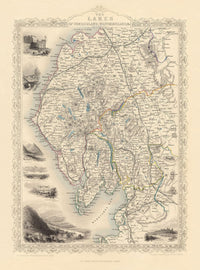 Autour des bords de la carte, il y a des gravures détaillées de magnifiques vues de la région des lacs, y compris quelques-unes de Windermere, du château de Lancaster, de Keswick et de Carlisle.