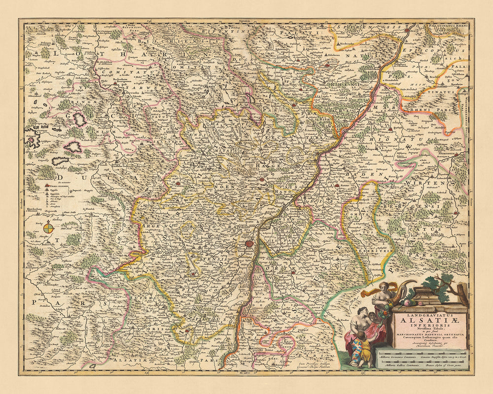 Cette carte, initialement intitulée "Landgraviatus Alsatiae Inferioris Novissima Tabula : in qua simul Marchionatus Badensis, Ortenavia, Caeteraquetam Lotharingica quam alia Confinia", se traduit par "La dernière carte du Comté inférieur d'Alsace: dans laquelle figurent à la fois le Margraviat de Bade, Ortenau, et les autres frontières lorraines et autres sont indiquées. Ce titre révèle la vaste étendue du territoire couvert par cette carte, qui comprend non seulement la Basse-Alsace, mais aussi le Margraviat de Bade, l'Ortenau et d'autres régions limitrophes.