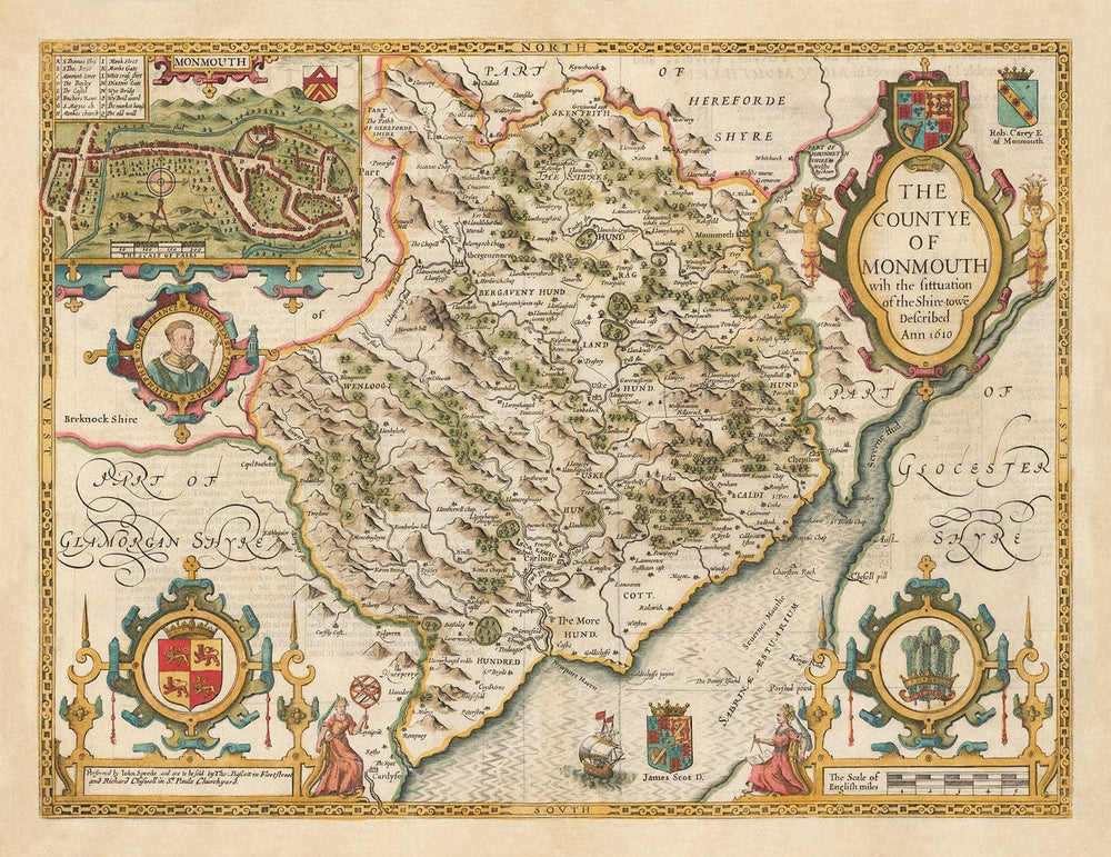 De nombreuses villes, villages et cités de Monmouthshire sont déjà visibles sur cette carte, y compris Abergavenny, Chepstow, Caldicot et d'autres. Dans le coin supérieur gauche se trouve une belle gravure détaillée de la ville de Monmouth.