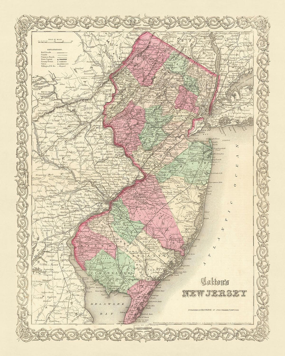 Plongez-vous dans la riche histoire des États-Unis avec cette magnifique carte du New Jersey de 1855, réalisée par le célèbre cartographe JH Colton. Cette pièce témoigne des débuts de la cartographie américaine, capturant le Garden State à une époque où bon nombre de ses colonies en étaient encore à leurs balbutiements. La carte met en valeur le savoir-faire méticuleux et l'attention portée aux détails qui ont solidifié la réputation de Colton comme l'un des meilleurs cartographes américains de son époque.