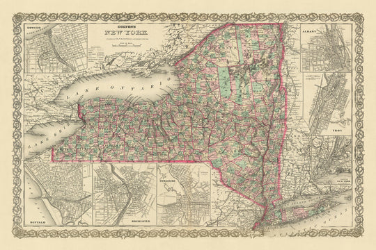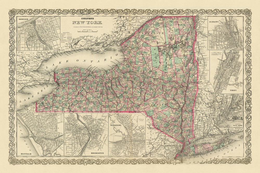 Ancienne carte de New York par JH Colton, 1874 : New York, Buffalo, Rochester, Albany, Syracuse