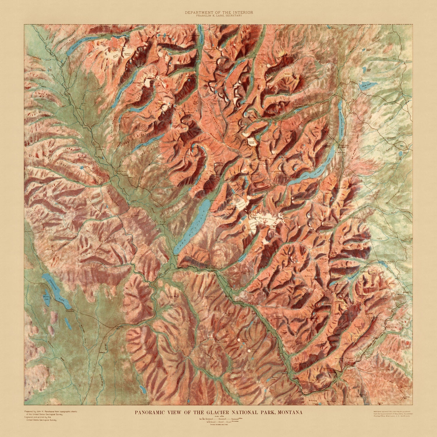 Old Relief Map of Glacier National Park, Montana, 1914: Logan Pass, St. Mary L., L. McDonald, Many Glacier, Chief Mt