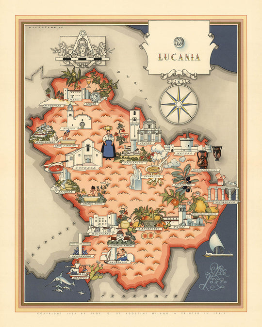 Cette carte de la région italienne de Lucanie, initialement publiée en 1938 par la société cartographique italienne Istituto Geografico De Agostini, est un exemple magnifique et détaillé de carte thématique et picturale. La carte se concentre principalement sur la région italienne de Lucanie, désormais connue sous le nom de Basilicate. Cette région est située dans le sud de l’Italie et est connue pour sa riche histoire, sa culture et sa beauté naturelle. La carte est ornée de vignettes colorées qui représentent divers aspects de la région, notamment son architecture, son agriculture et ses ressources naturelles. Les villes et villages sont clairement étiquetés et la carte présente également des accents argentés et dorés, ajoutant à son aspect luxueux.