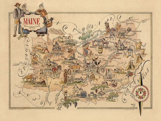 - La carte est une représentation artistique de la région de Maine du milieu du 20ème siècle, reflétant les aspects culturels et historiques de la région durant cette période.