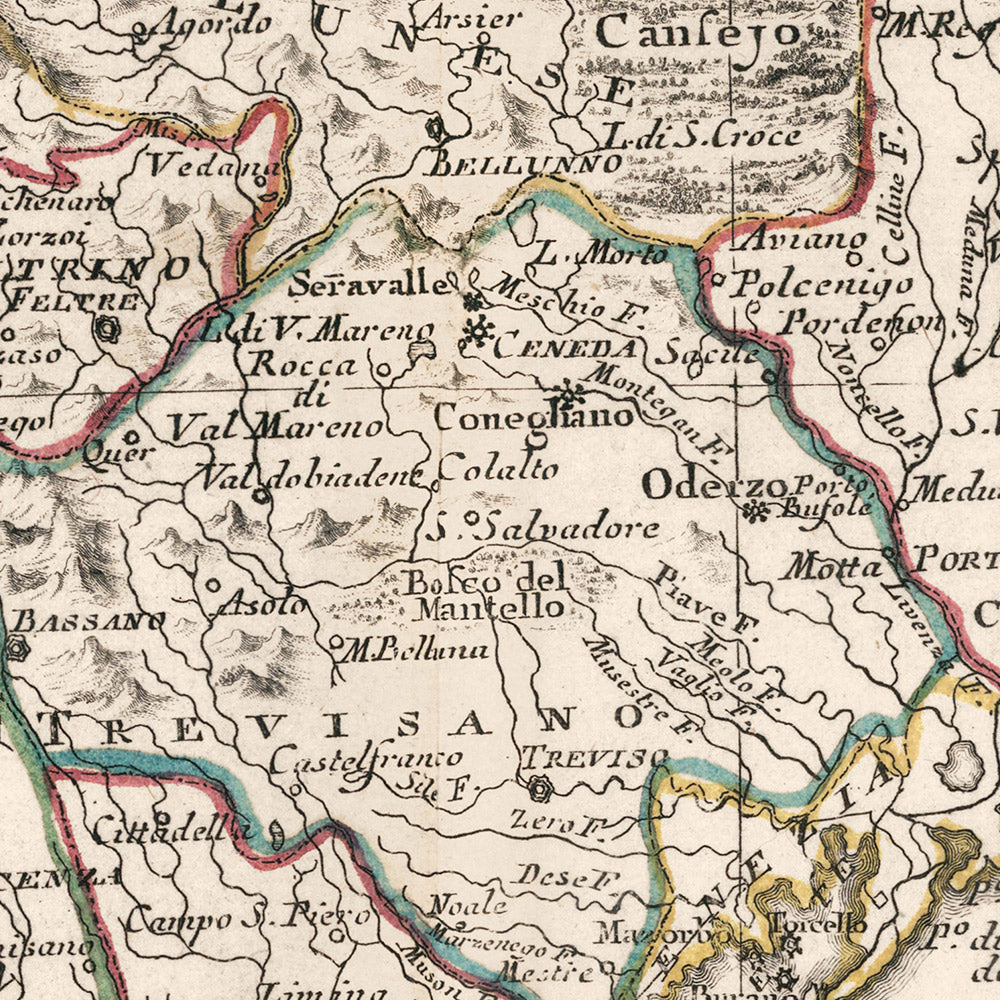 The map captures the Terraferma in its late-Republican configuration, a political mosaic just years before Napoleonic upheaval. Borders are traced against potent neighbors—Habsburg Tyrol in the north and the patchwork of Italian duchies and papal lands to the west and south—revealing the careful diplomacy and fortification that sustained Venetian stability. Rivers double as corridors of grain, timber, and stone; the Brenta’s engineered channels echo centuries of hydraulic mastery that linked lagoon and interior. Verona’s walls, Vicenza’s prosperous hinterland, Padua’s learned heritage, Treviso’s gateway to Friuli, and Belluno’s mountain wards all read clearly through Zatta’s symbology. The result is a political landscape that also feels lived-in: a countryside of villas, vineyards, and market towns coherently nested within provincial bounds.