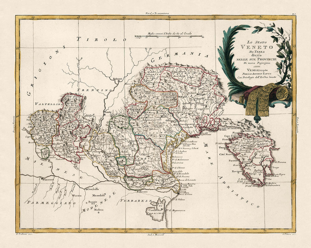 Old Map of Veneto, Italy by Zatta, 1782: Venice, Verona, Padua, Vicenza, Rovigo