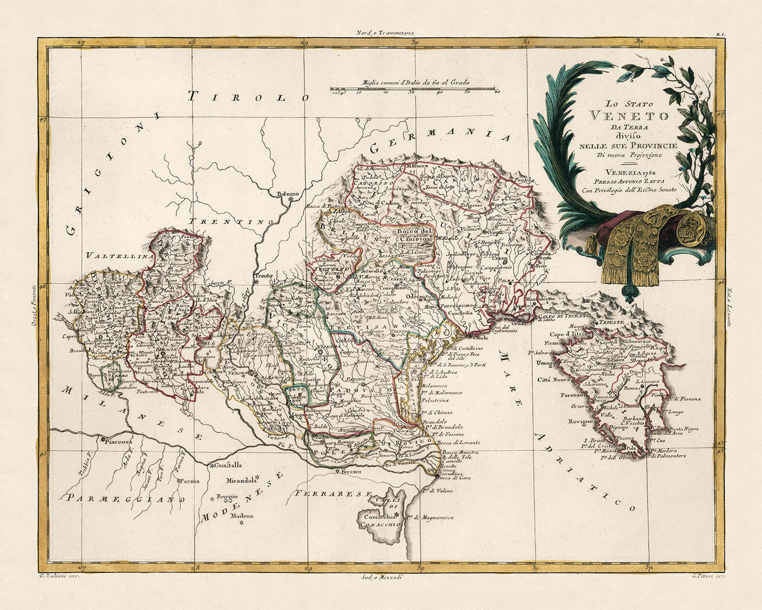 Lo Stato veneto da terra: diviso nelle sue provincie: Di nuova projezione is Antonio Zatta’s masterful portrait of the Venetian mainland at the twilight of the Serenissima. Published in Venice in 1782, this double-page political and physical map unites Enlightenment precision with Venetian grace. Administrative divisions are crisply delineated and handsomely washed in color, while a network of rivers and canals threads through lagoons, plains, and Alpine foothills. Pictorial relief breathes volume into serried ridges and gentle hills, guiding the eye from the Venetian Lagoon toward the distant Prealps. The “new projection” promised in the title yields a confident geometry that clarifies borders and distances without forfeiting charm. A decorative cartouche, festooned with ribbon and foliage, anchors the composition, embodying the refined artistry of late 18th-century Venetian engraving.