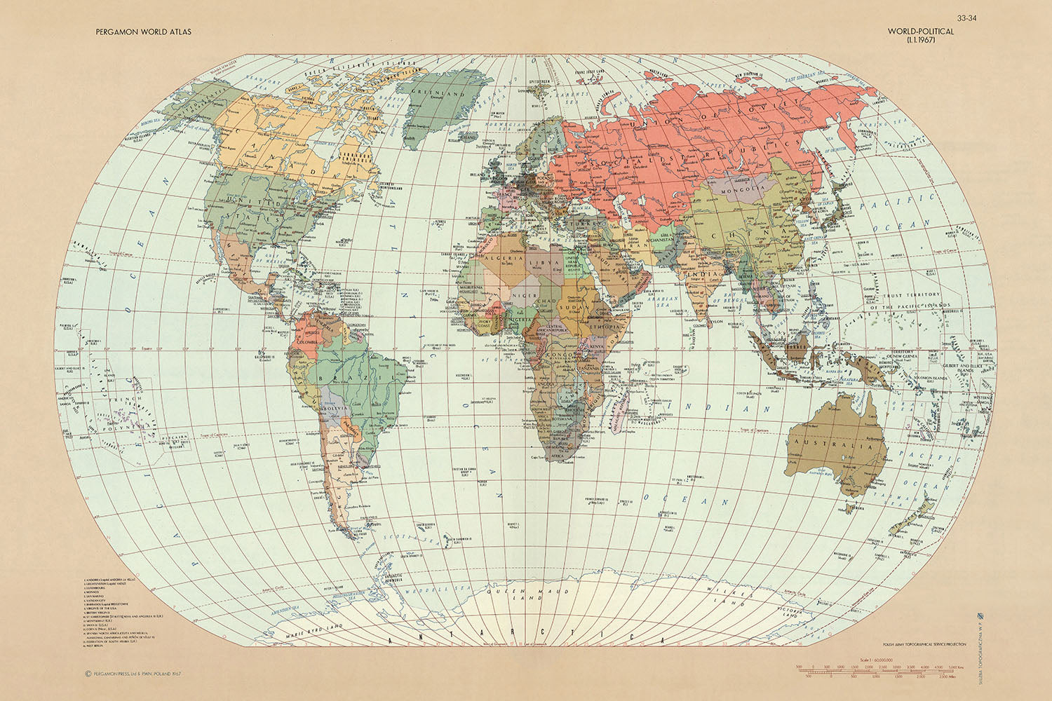 Cette carte est une fenêtre sur un moment charnière de l'histoire, offrant une perspective unique sur le paysage politique et géographique du monde tel qu'il était en 1967. Que vous soyez un collectionneur, un passionné d'histoire ou simplement quelqu'un qui apprécie la cartographie fine, cette La carte est une pièce remarquable qui donne vie au passé avec des détails et un talent artistique inégalés.