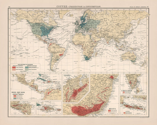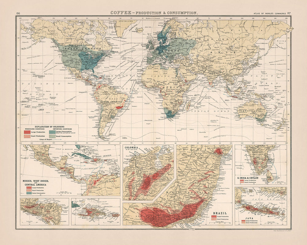 Essentiellement, cette carte est un trésor pour les historiens, les géographes, les amateurs de café et les connaisseurs de cartographie fine. Il transcende sa forme physique pour devenir un portail vers le passé, nous invitant à explorer la signification historique et l'impact culturel du café sur la scène mondiale. La carte « Café - Production et consommation » de JG Bartholomew n'est pas seulement un morceau d'histoire ; c’est un récit tissé dans le tissu de la culture mondiale du café, un récit qui continue d’évoluer jusqu’à ce jour.