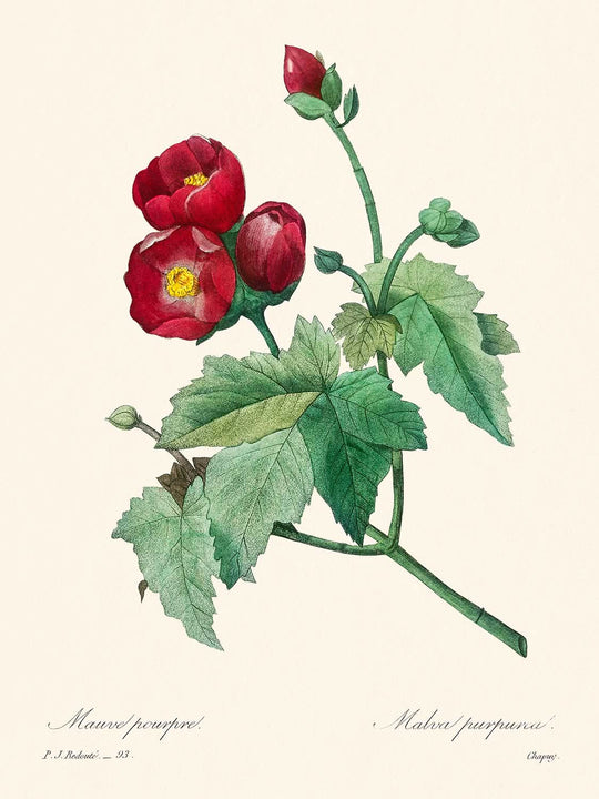 Présentation de « Purple Mallow » de Pierre-Joseph Redouté, une splendide illustration botanique victorienne publiée pour la première fois en 1802. Reconnu comme l'un des plus grands illustrateurs botaniques de tous les temps, Redouté a passé une grande partie de sa carrière à immortaliser la flore du château de Malmaison à la demande de Joséphine Bonaparte, l'épouse de Napoléon. Son illustre carrière a débuté en tant que professeur de peinture de Marie-Antoinette et s'est épanouie avec des œuvres représentant plus de 2 100 espèces, offrant un nouveau point de vue sur la beauté naturelle.