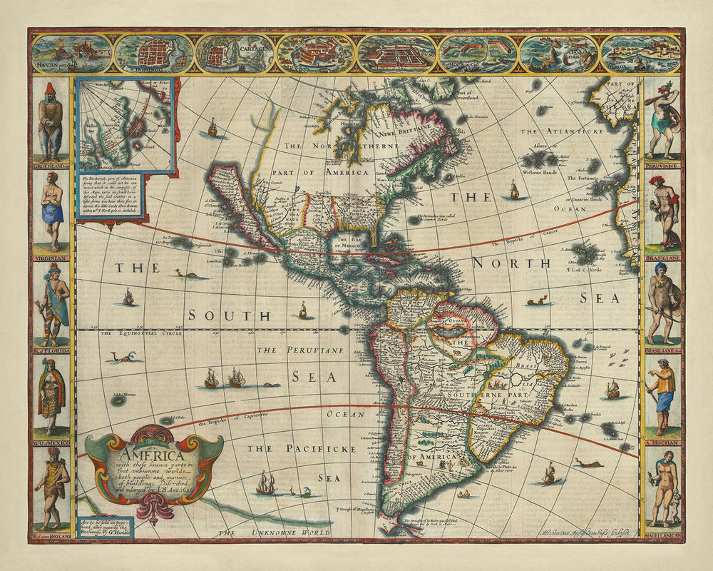 Esthétiquement, la carte de Speed est une merveille de la cartographie moderne précoce, ornée d'éléments décoratifs qui captivent l'imagination du spectateur. Les côtés de la carte présentent des vignettes de costumes autochtones provenant de régions telles que le Groenland, la Virginie, la Floride et le Pérou, offrant un aperçu des cultures diverses rencontrées par les explorateurs européens. Le haut de la carte met en avant huit plans de villes méticuleusement dessinés des grandes villes du Nouveau Monde, fournissant une fenêtre sur les paysages urbains de l'époque. Les cartes insets du Groenland et de l'Islande ajoutent une autre couche de détail, enrichissant la composition globale.