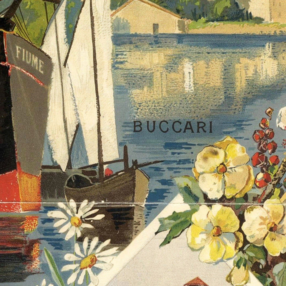 About the places: the composition highlights the Adriatic coastline at Fiume and nearby Buccari (Bakar), celebrated for deep blue waters and sheltered bays, and contrasts them with the cultural vitality of Zagreb. In the 1890s, these were aspirational names—ports humming with steamships, promenades lined with cafés, and an inland capital whose theaters, markets, and museums rewarded the grand‑tour spirit. The poster is both an invitation and a promise: step aboard and discover beaches, harbors, and boulevards joined by efficient state railways.