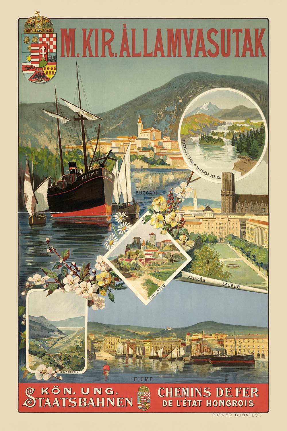 Rijeka Travel Poster: Fiume – Buccari – Zagreb by Royal Hungarian State Railways, 1890