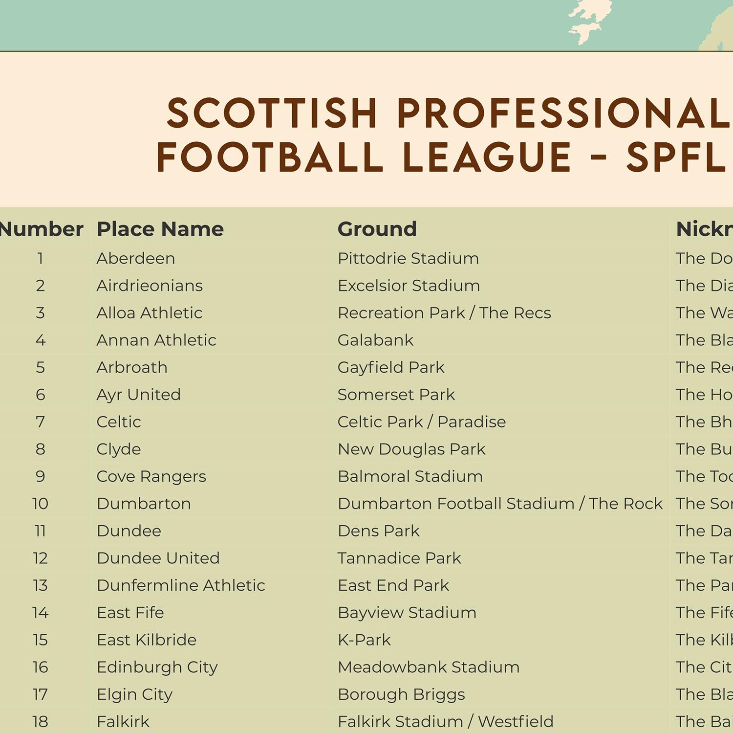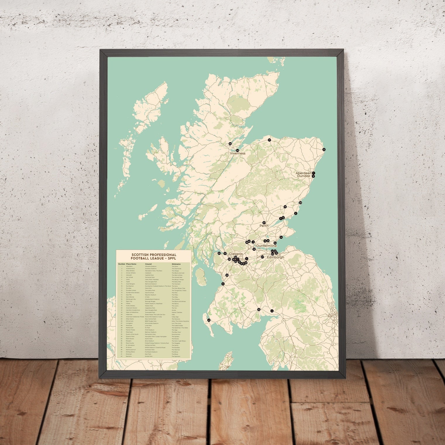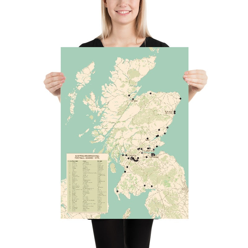 Cette carte moderne de l’Écosse par The Unique Maps Co. recense les 42 clubs de la Scottish Professional Football League (SPFL) dans un design épuré, digne d’un mur — un instantané parfait de la véritable géographie du football écossais, des rivalités denses du Central Belt aux longs trajets vers les Highlands et jusqu’aux côtes.