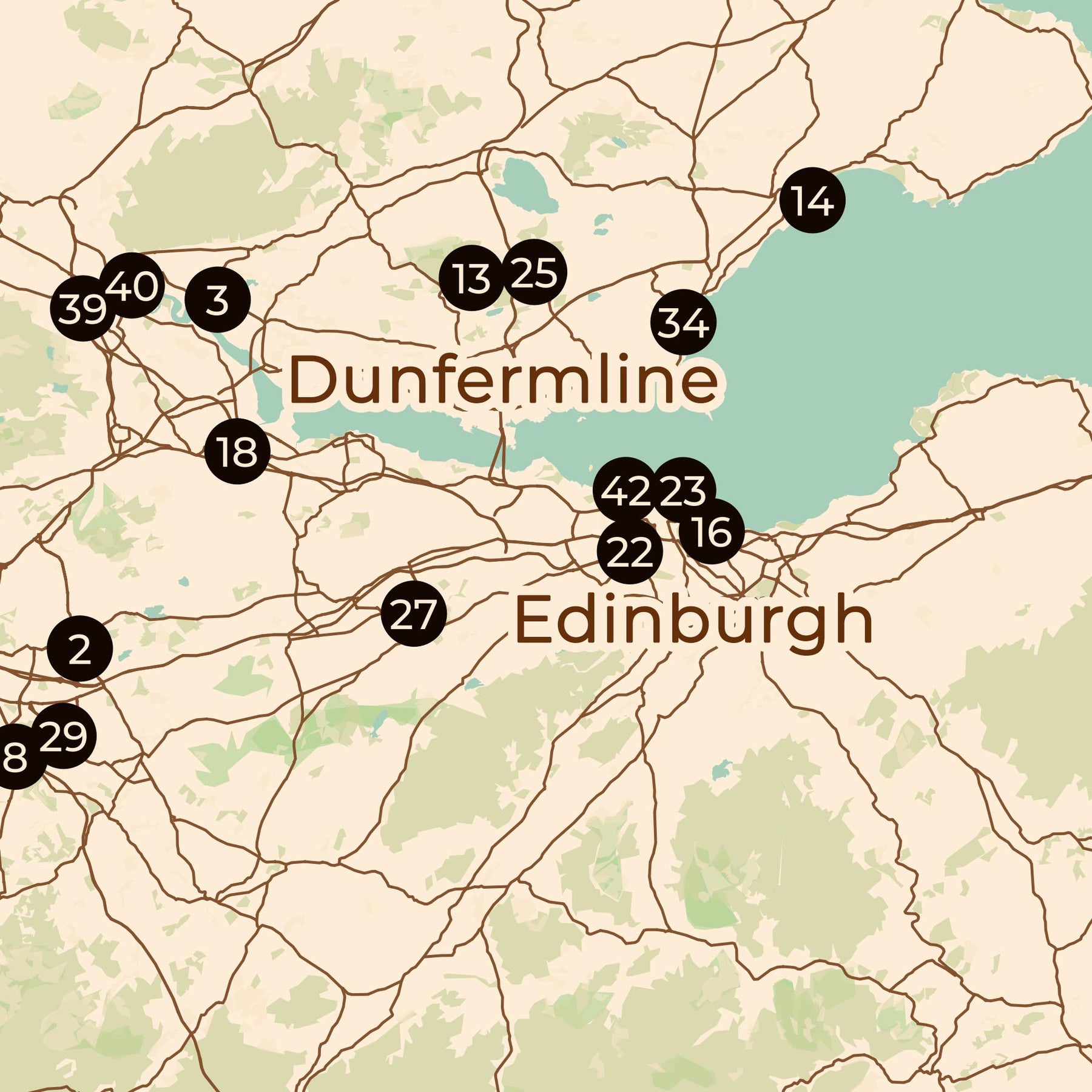 Sur fond d’une carte contemporaine de l’Écosse, l’emplacement de chaque club est indiqué par un point numéroté, ce qui rend l’exploration immédiatement satisfaisante. On y voit d’un seul coup d’œil la structure des déplacements à l’extérieur, la logique des derbies locaux, et la manière dont les communautés de football se regroupent autour des villes, des bourgs et des axes de transport.