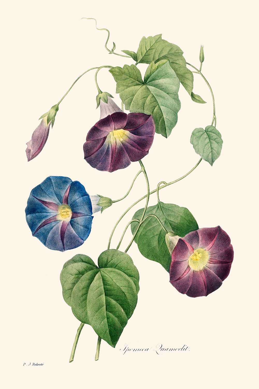 La Belle-de-jour, réalisée par le très estimé Pierre-Joseph Redouté en 1827, est une splendide représentation de l'illustration botanique victorienne. Reconnu comme l'un des plus grands illustrateurs botaniques de son temps, Redouté a joué un rôle essentiel dans l'immortalisation des merveilles botaniques, principalement au Château de Malmaison, sous le patronage de Joséphine Bonaparte, l'épouse de Napoléon. Cette pièce, représentant la beauté délicate de l'Ipomoea tricolor (communément appelée Belle-de-jour), témoigne du savoir-faire méticuleux de Redouté et de son amour pour les sujets floraux.