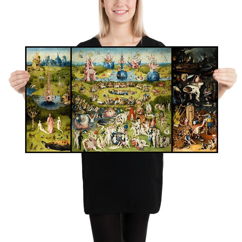 Color, style, and the pleasure of living with it: Bosch’s palette glows with lapis blues, verdant greens, and shell-pink accents set against warm earth tones; he layers delicate glazes and razor-fine strokes to describe foliage, water, and flesh with jewel-box precision. Organic forms, orbs, and spires interlock with geometric structures, while elongated figures and extraordinary hybrids animate every inch of the landscape. As a print, this piece rewards slow looking—each revisit unveils new micro-dramas—making it a captivating focal point for a library, study, or living room, and a conversation starter for anyone drawn to symbolism, storytelling, or the surreal.