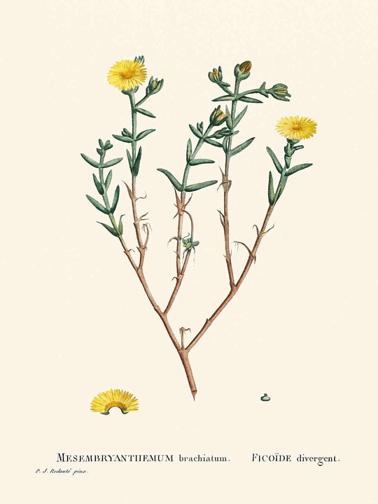 Présentation de l'exquise « Figuier à trois fourches » du célèbre artiste botanique Pierre-Joseph Redouté, publiée à l'origine en 1802. Cette superbe illustration botanique victorienne capture la beauté délicate et les détails complexes du Mesembryanthemum brachiatum, également connu sous le nom de Figuier à trois fourches. Redouté, un artiste d'origine belge, est célèbre pour sa représentation magistrale de la flore, particulièrement connue pour son travail dans les jardins sereins du Château de Malmaison à la demande de Joséphine Bonaparte, l'épouse de Napoléon Bonaparte. L'illustre carrière de Redouté l'a vu publier plus de 2 100 peintures botaniques, documentant plus de 1 800 espèces différentes, consolidant son héritage en tant que l'un des plus grands illustrateurs botaniques de l'histoire.