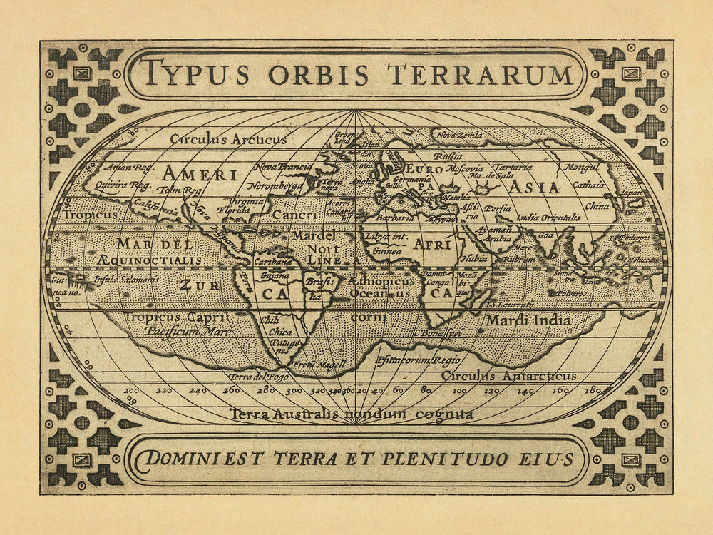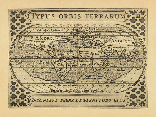 Le "Typus Orbis Terrarum" inclut également des régions spéculatives fascinantes, telles que Terra Australis nondum cognita, ou "la terre australe encore non découverte", qui s'étend sur tout le côté sud de la carte. Cette zone comprend la Terre de Feu et Psittacorum Regio, une région supposément densément peuplée de perroquets, reflétant les limites des connaissances contemporaines et la nature imaginative de la cartographie précoce. La carte montre également l'Amérique du Nord avec des toponymes familiers comme la Californie, la Virginie et la Floride, ainsi que des noms moins familiers comme Anian et Quivira, suggérant le passage du Nord-Ouest insaisissable.