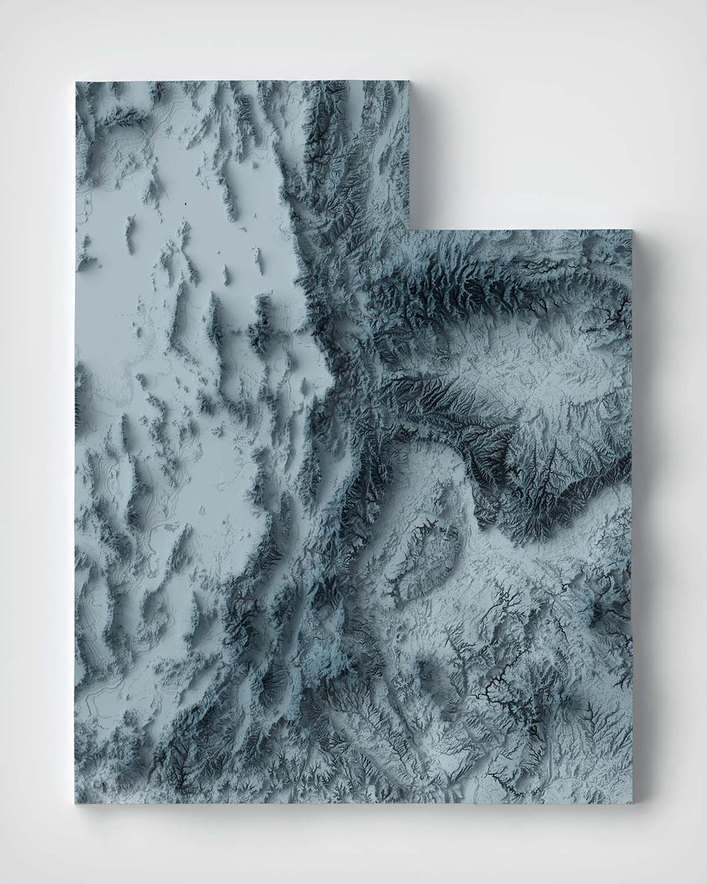 Utah, États-Unis d'Amérique, est une terre de contrastes dramatiques et de grandeur à couper le souffle—un symbole de l'Ouest américain immortalisé dans un relief accidenté. Cette carte capture la variation frappante de la géographie de l'Utah, mettant en valeur l'interaction de la lumière et de l'ombre pour révéler les majestueuses montagnes Wasatch et Uinta, dont les crêtes dentelées et les sommets élevés tranchent à travers les hauteurs de l'État. L'effet est de rendre chaque ondulation et sommet d'une clarté vive, vous permettant de tracer les plis complexes et les escarpements dramatiques qui façonnent la ligne d'horizon de l'Utah.