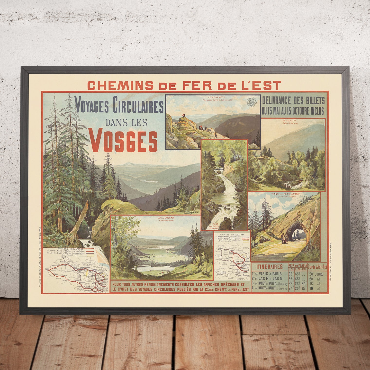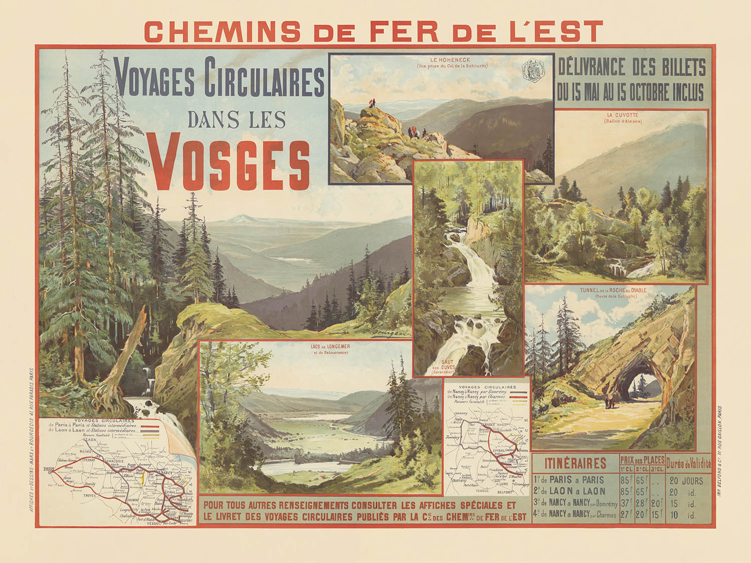The subject here—the Vosges Mountains—was a prized summer destination of the era, with the Chemins de Fer de l’Est advertising “circular” tours through pine forests, lakes, and high passes. Several vignettes are labeled, including LE HOHENECK (Vue prise du Col de la Schlucht), LACS de LONGEMER et de Retournemer, SAUT des CUVES (Gérardmer), and TUNNEL de la ROCHE du DIABLE (Route de la Schlucht). In the upper right, a panel notes Délivrance des billets du 15 mai au 15 octobre inclus, while a table at lower right lists ITINÉRAIRES such as PARIS à PARIS and LAON à LAON with durations up to 20 JOURS. Two small route maps along the bottom trace the railway network, making the romance of the journey feel tangible.