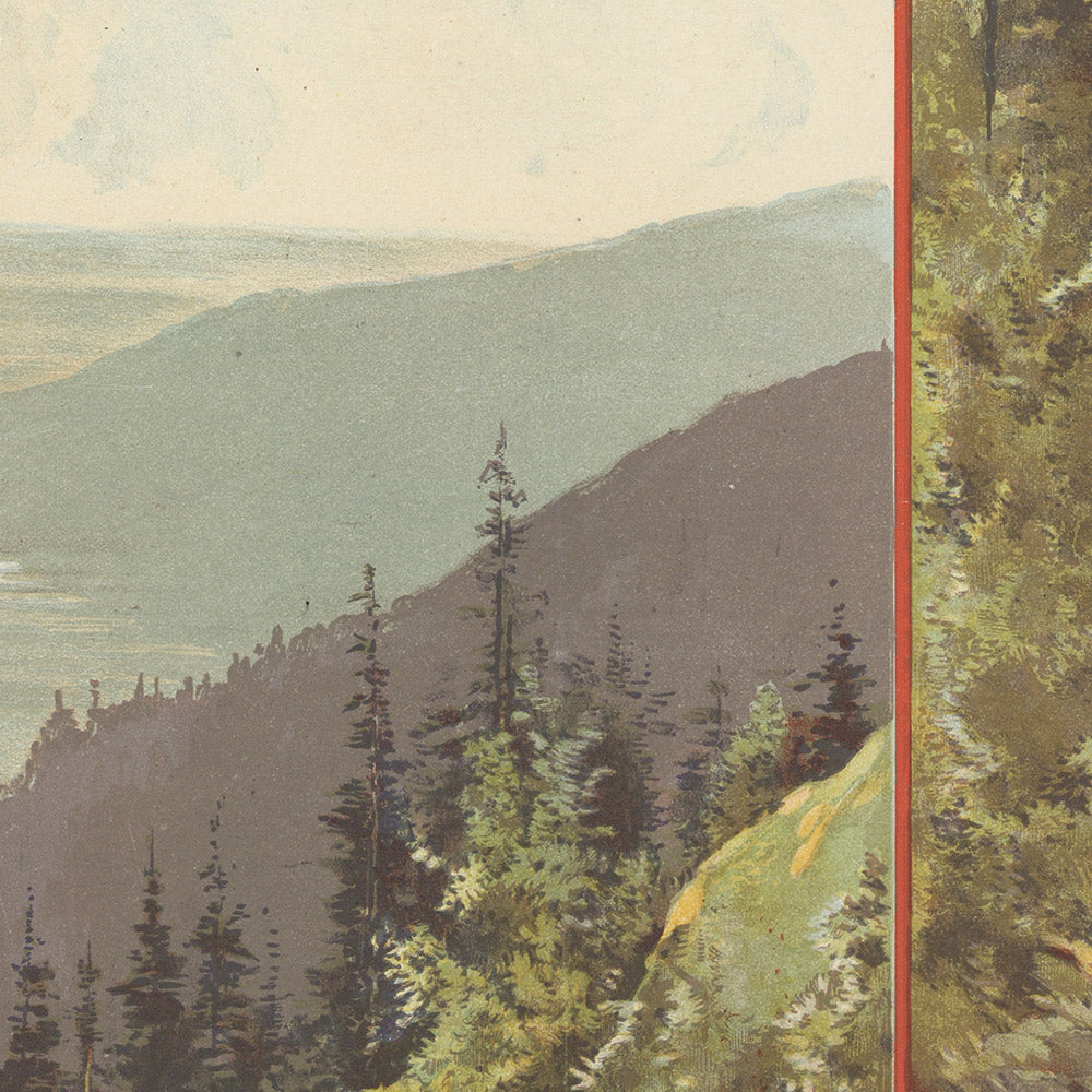 Design-wise, it’s a masterclass in late-19th-century poster art. The palette is dominated by fresh greens and sky blues, balanced by warm browns of rock and path. Slate-blue type and brick-red borders tie the many views together, and the sweeping evergreen at left frames a valley bathed in haze—an effect Bourgeois achieves with soft, atmospheric gradations. The composition’s grid of scenes reads like a traveler’s scrapbook, making this a wonderful piece for anyone who loves the Vosges, French rail history, or mountain landscapes.