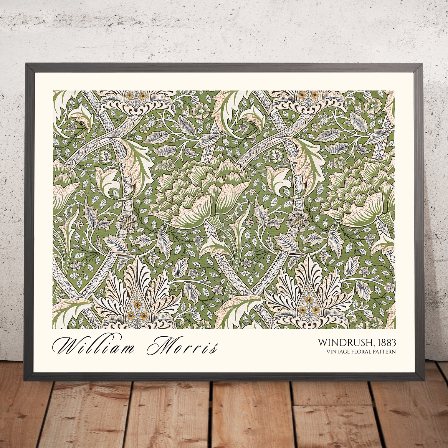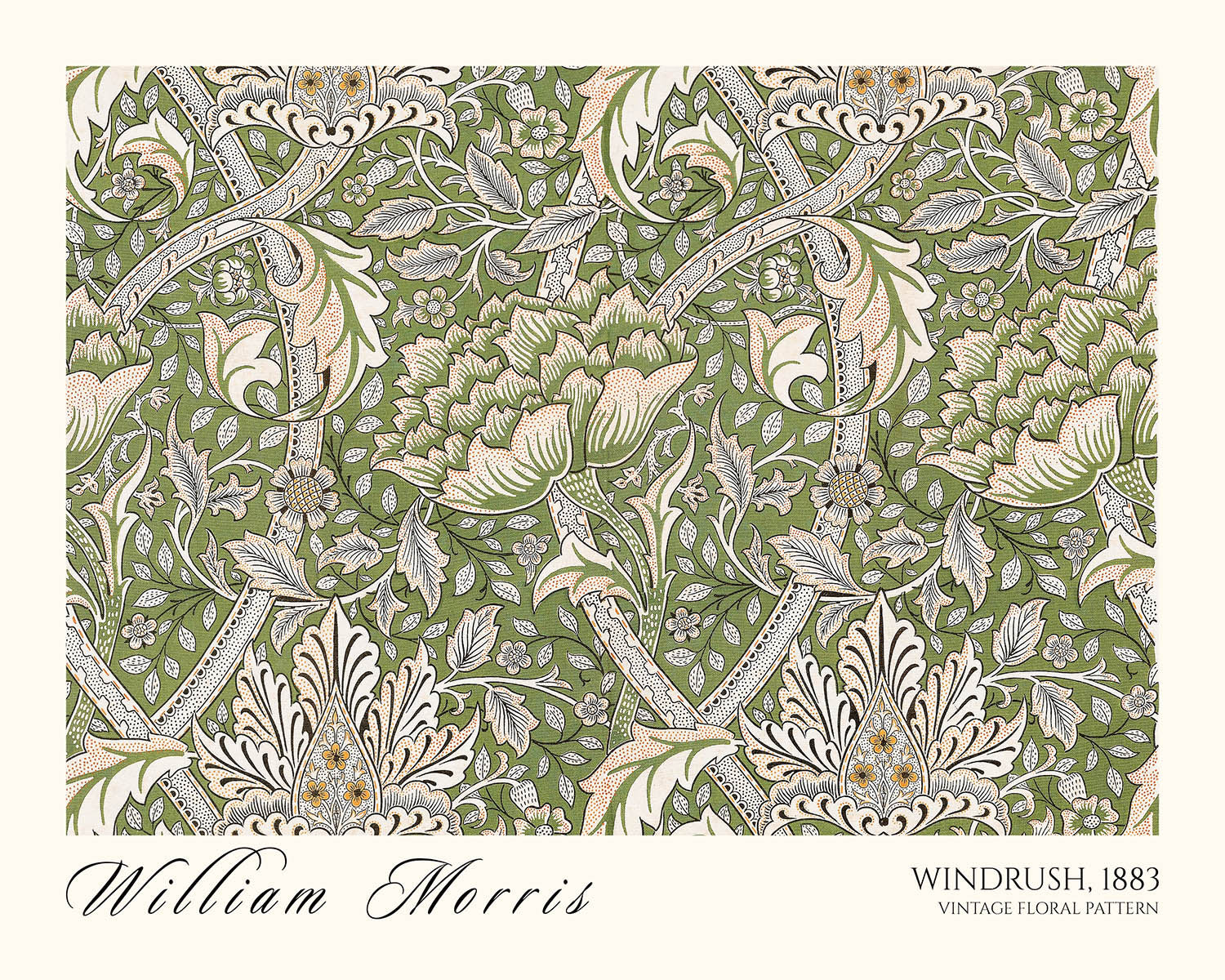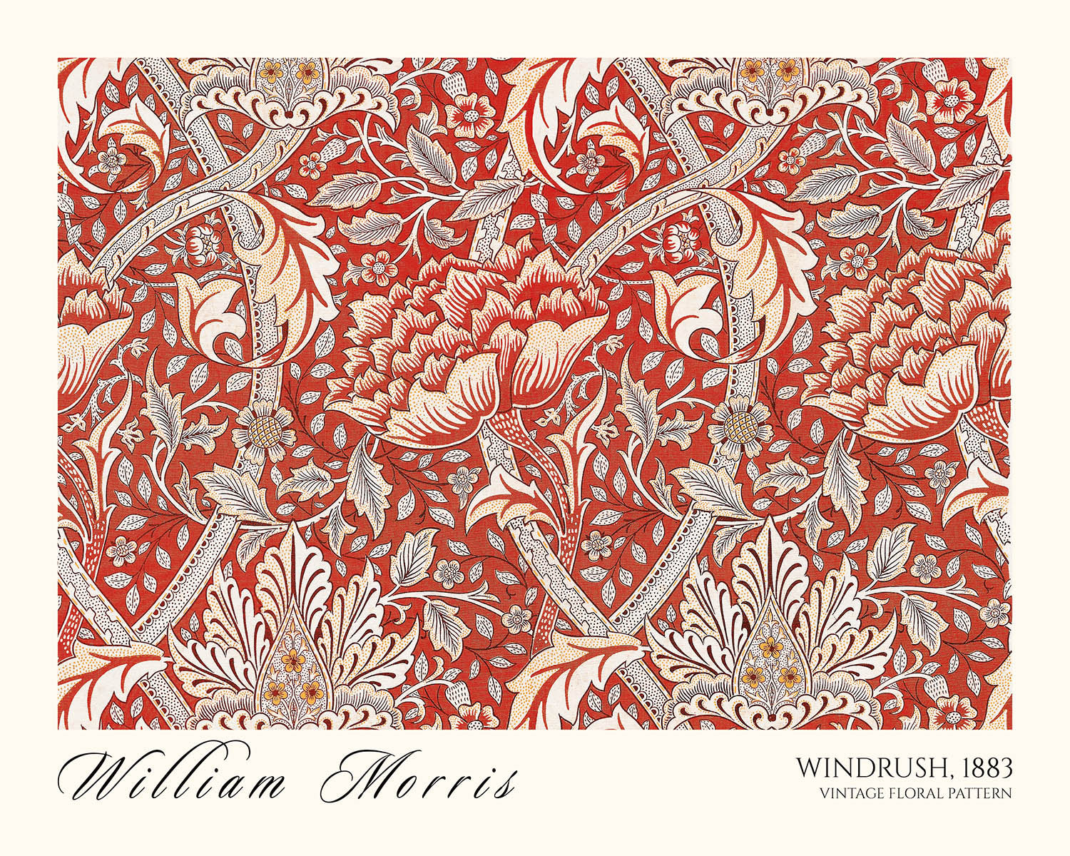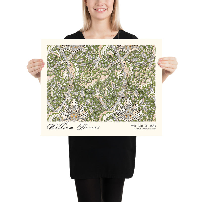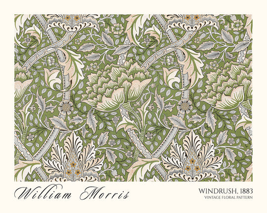 Windrush by William Morris (1883) is a quintessential Arts & Crafts pattern that channels the grace of the English countryside into a rhythmic, repeating design. This restored fine art print revives Morris’s original vision with crisp detail, revealing a luxuriant tangle of blossoms, scrolling foliage, and tender stems. Likely conceived for wallpaper—and equally suited to carpet, curtain, or other textile—Windrush embodies the movement’s celebration of nature and the hand of the artisan.