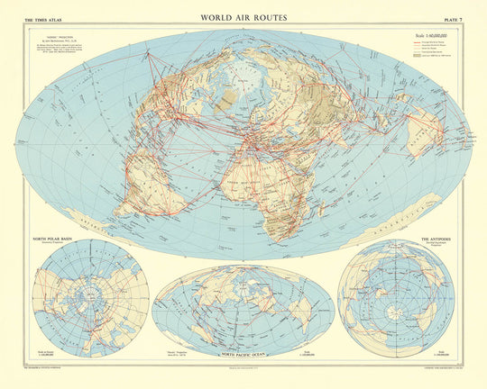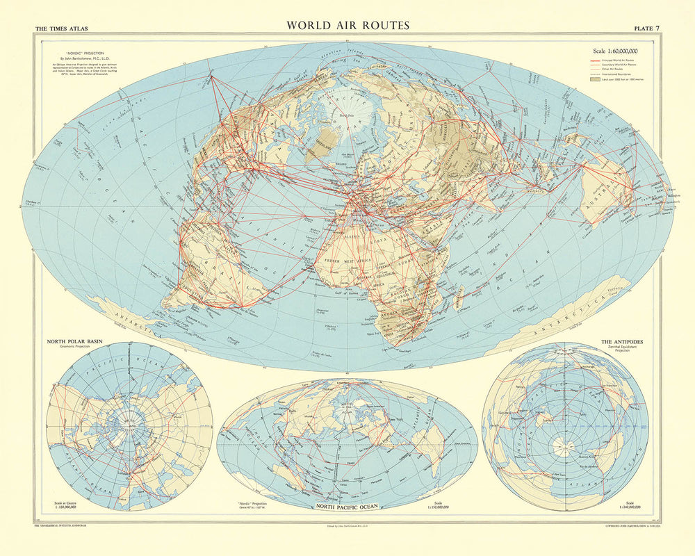 Carte des routes aériennes du monde dans de nombreuses projections différentes par Bartholomew, 1957