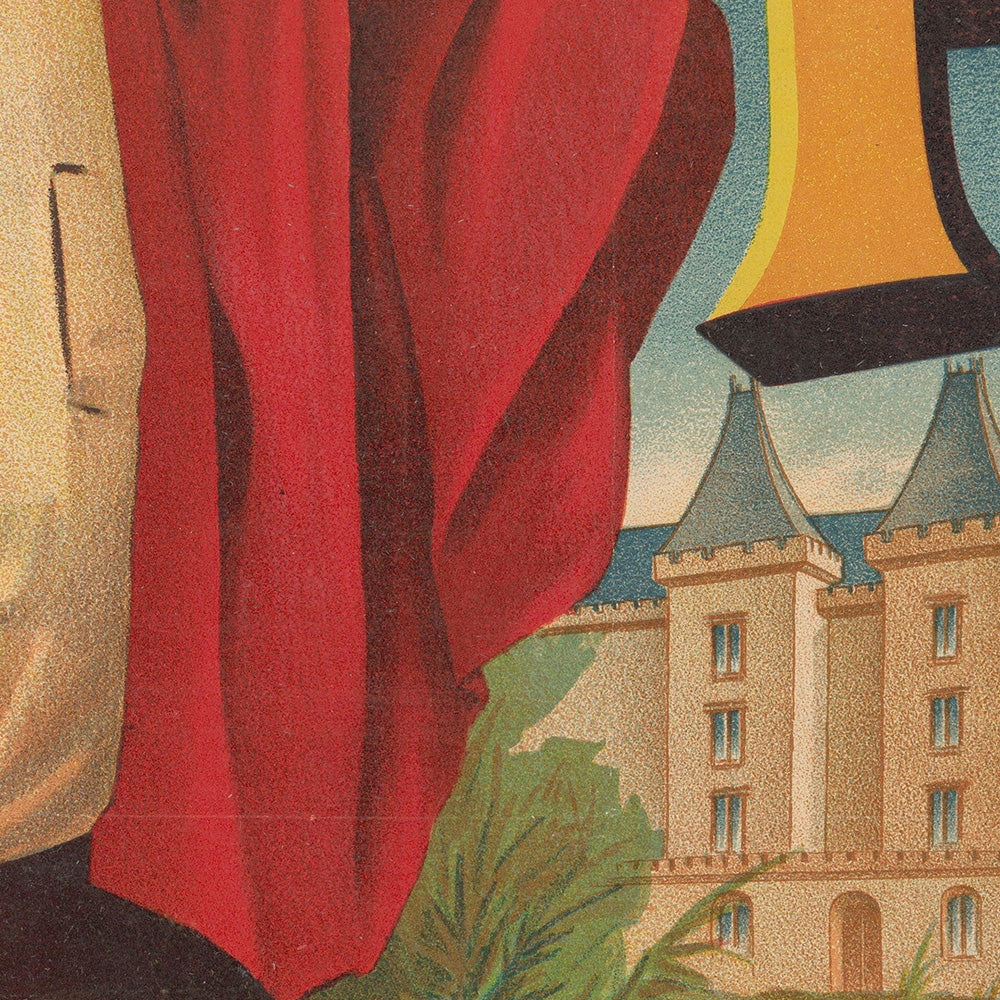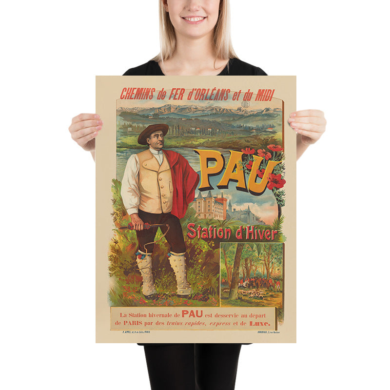 Chemins de Fer d’Orléans et du Midi. Pau, station d’hiver by Lith. F. Appel (1890) invites the viewer to the Pyrenean foothills of southwestern France. Commissioned to promote Pau’s celebrated winter season, the poster celebrates the town’s soft climate, mountain light, and aristocratic pastimes. A broad red headline sweeps across the top, while enormous golden letters spelling “PAU” are entwined with scarlet poppies; to the left, a proudly costumed Béarnais figure stands before the Gave de Pau and the snow-capped Pyrenees, with the turreted Château de Pau—birthplace of Henry IV—prominent in the middle distance. A small vignette shows a lively hunt beneath plane trees, a nod to the town’s fashionable sporting life.
