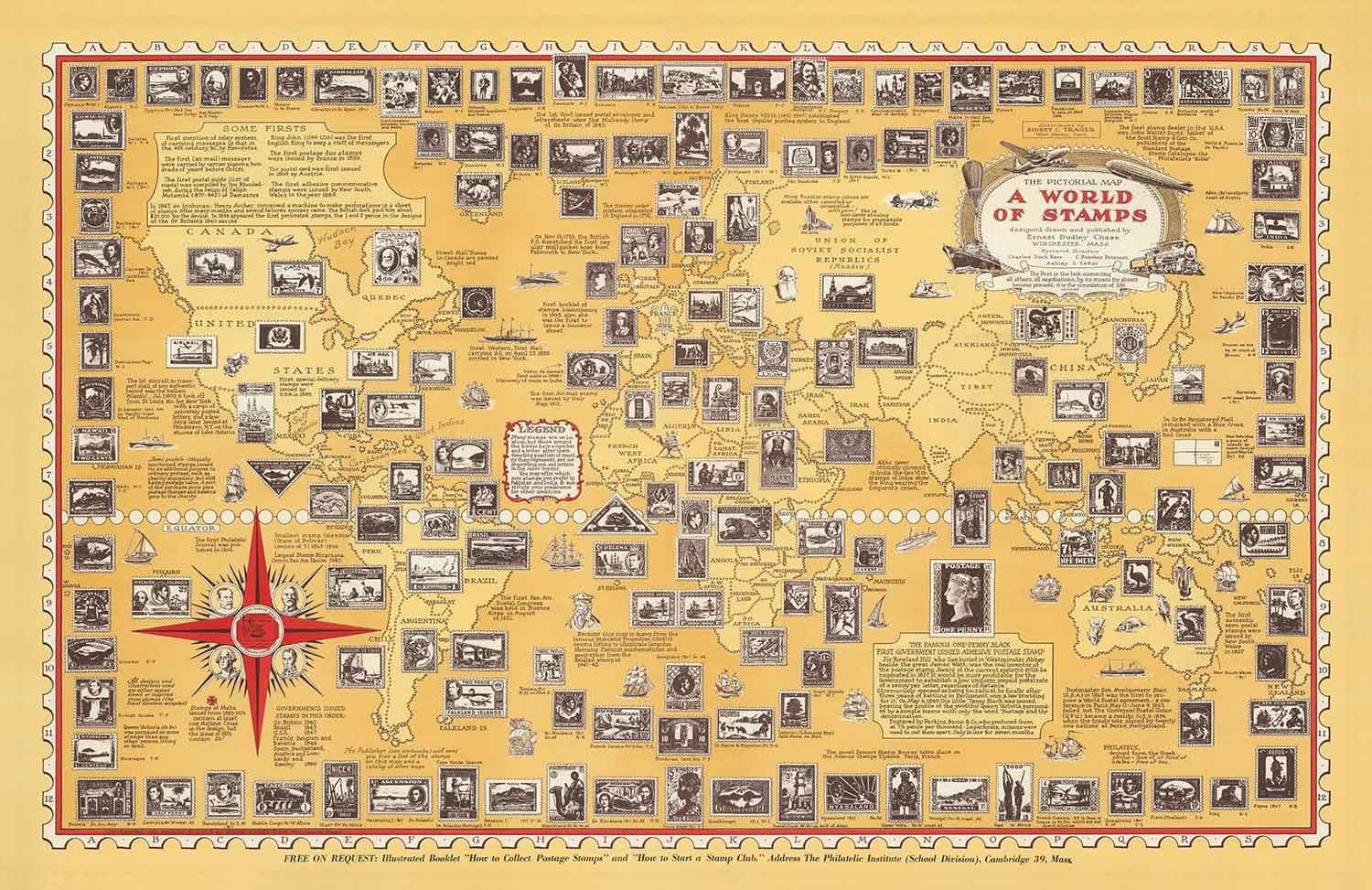 Mappa del Mondo con Vecchi Francobolli, 1947 di E. Chase: Atlante Storico degli Uffici Postali, Luoghi di Interesse, Penny Black