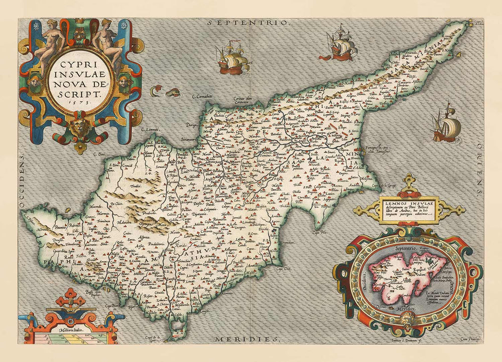 Rara Mappa Antica di Cipro di Abraham Ortelius, 1573: Nicosia, Kyrenia, Famagosta, Limassol, Pafos