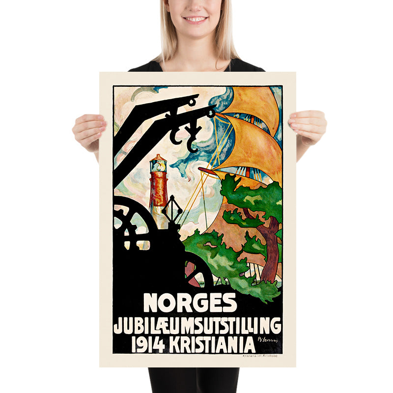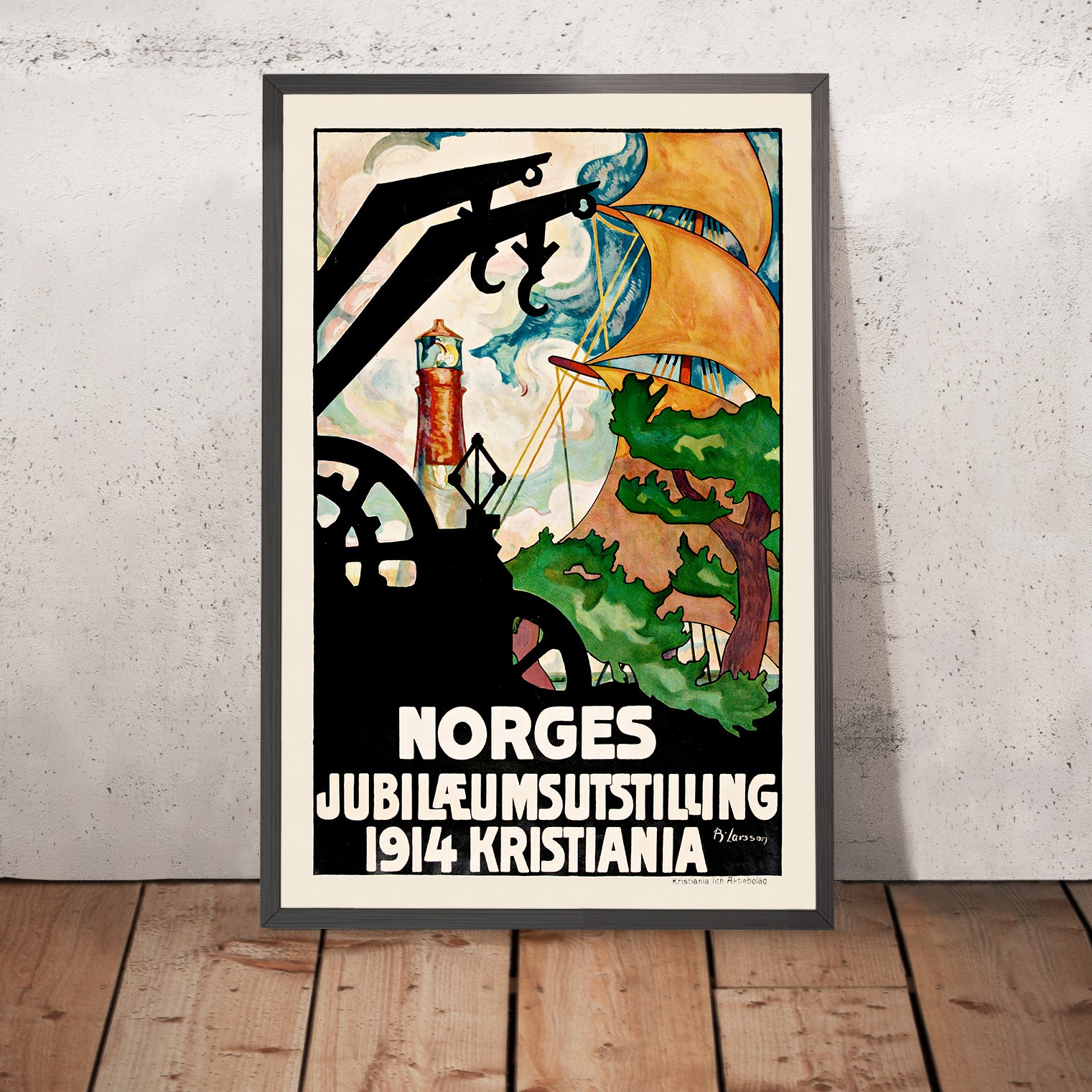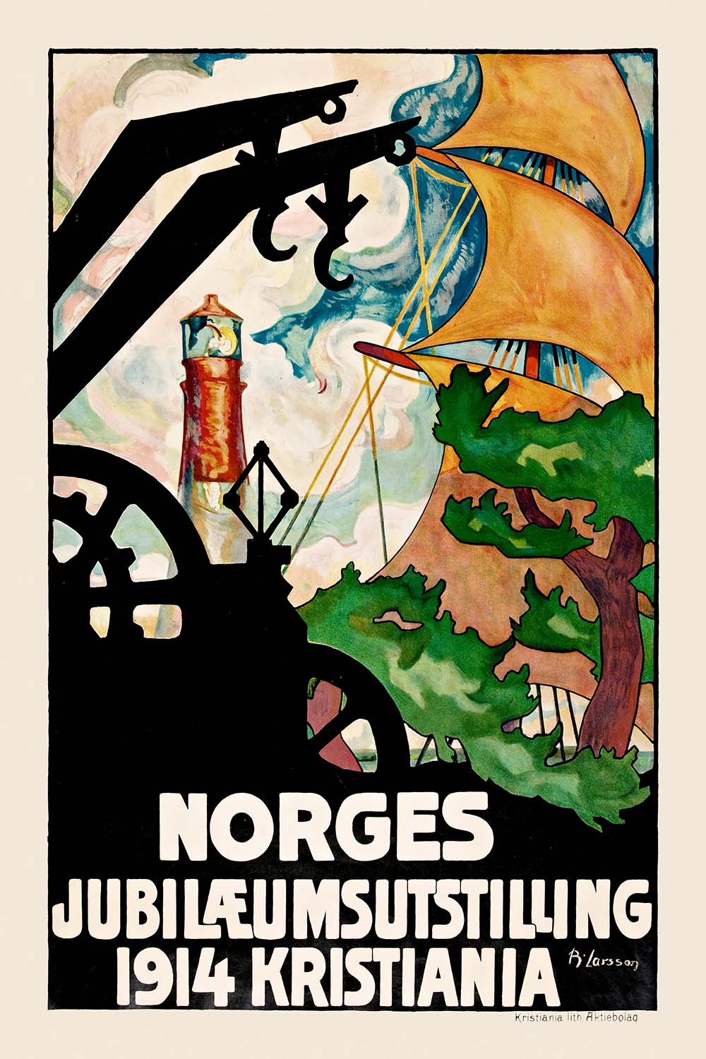 Norges Jubilæumsutstilling 1914 Kristiania by Brynjulf Larsson is a striking Art Nouveau travel poster created for Norway’s Jubilee Exhibition of 1914—held in the city then known as Kristiania (today Oslo). On the eve of the First World War, the exhibition celebrated a century of Norwegian progress and the 100th anniversary of the 1814 Constitution, and Larsson’s design captures that spirit with an emblematic meeting of sea, forest, and industry. The poster’s bold title—Norges Jubilæumsutstilling 1914 Kristiania—anchors a composition where cranes, rigging, and a billowing sail share the stage with trees and racing clouds, projecting national confidence and modern vitality.