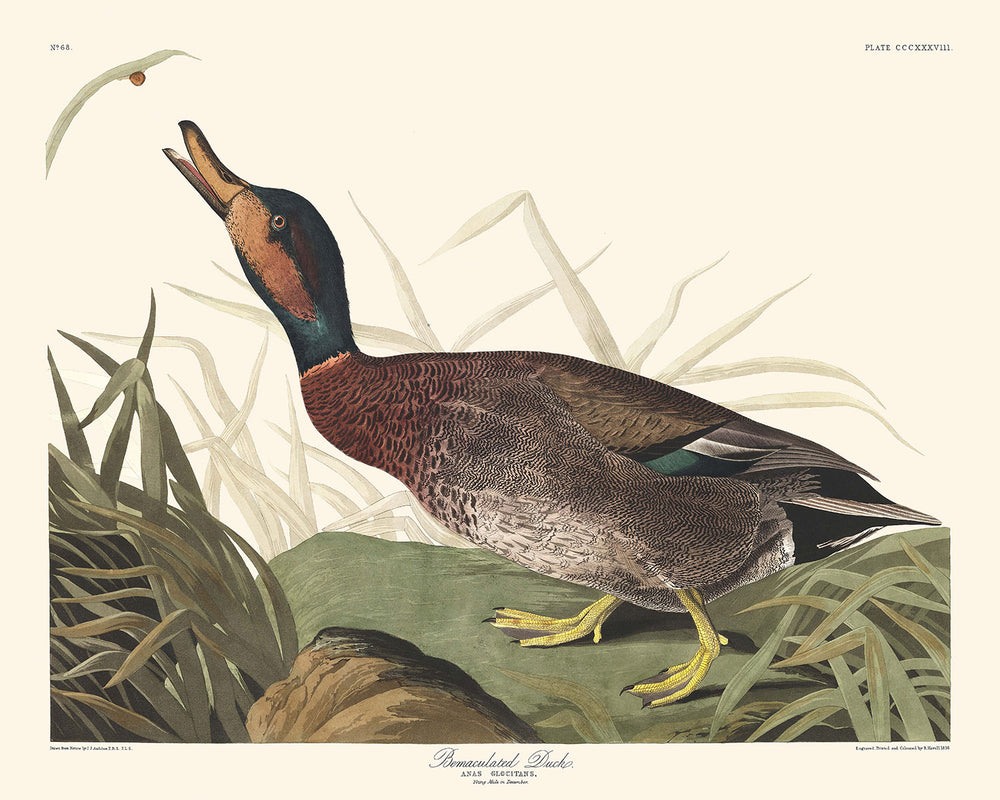 Lo stile di illustrazione di Audubon è niente meno che iconico, noto per il formato a grandezza naturale che permetteva un'enorme dettaglio e precisione nelle sue rappresentazioni. Questa particolare opera d'arte, Bemaculated Duck, mostra la sua straordinaria capacità di catturare sia i dettagli intricati dell'uccello che la bellezza del suo habitat naturale. I ricchi colori naturali e la posa realistica trasmettono la grazia e la vitalità dell'anatra, rendendola un pezzo affascinante per qualsiasi spazio.