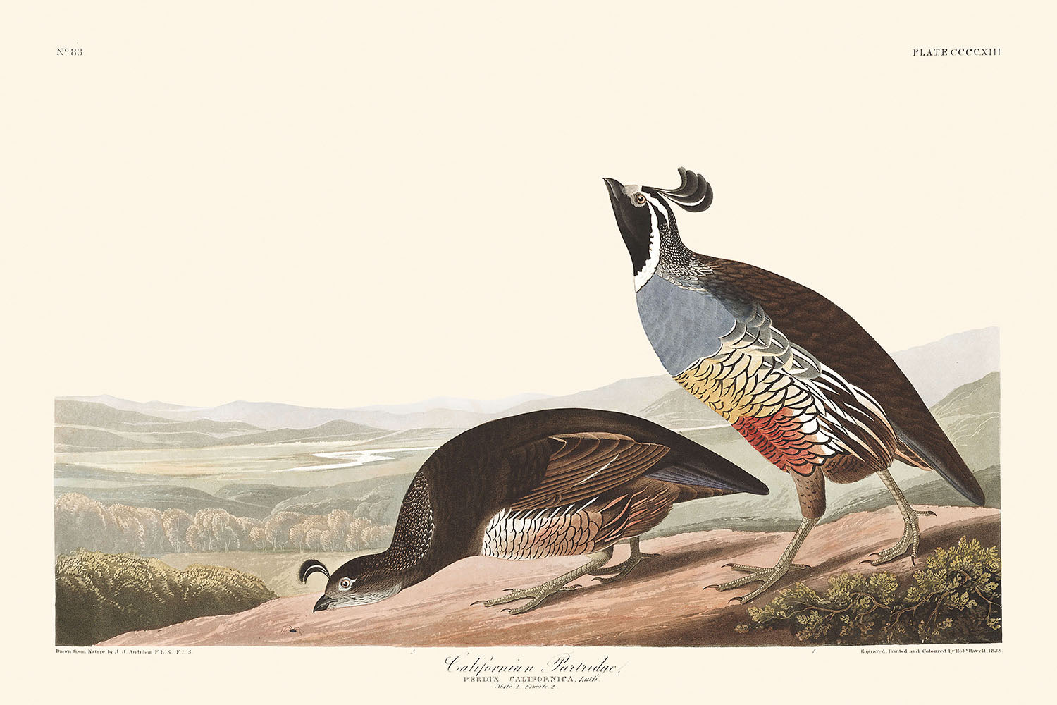 L'illustrazione del California Partridge è particolarmente notevole per il suo inserimento nella documentazione delle specie trovate durante l'infelice spedizione di La Pérouse. La dedizione di Audubon è evidente attraverso i dettagli straordinari e le ricche, vivaci tonalità del partridge, che creano una rappresentazione dinamica e realistica. Il suo attento uso di colore e forma consente allo spettatore di apprezzare il piumaggio intricato e la postura unica dell'uccello.