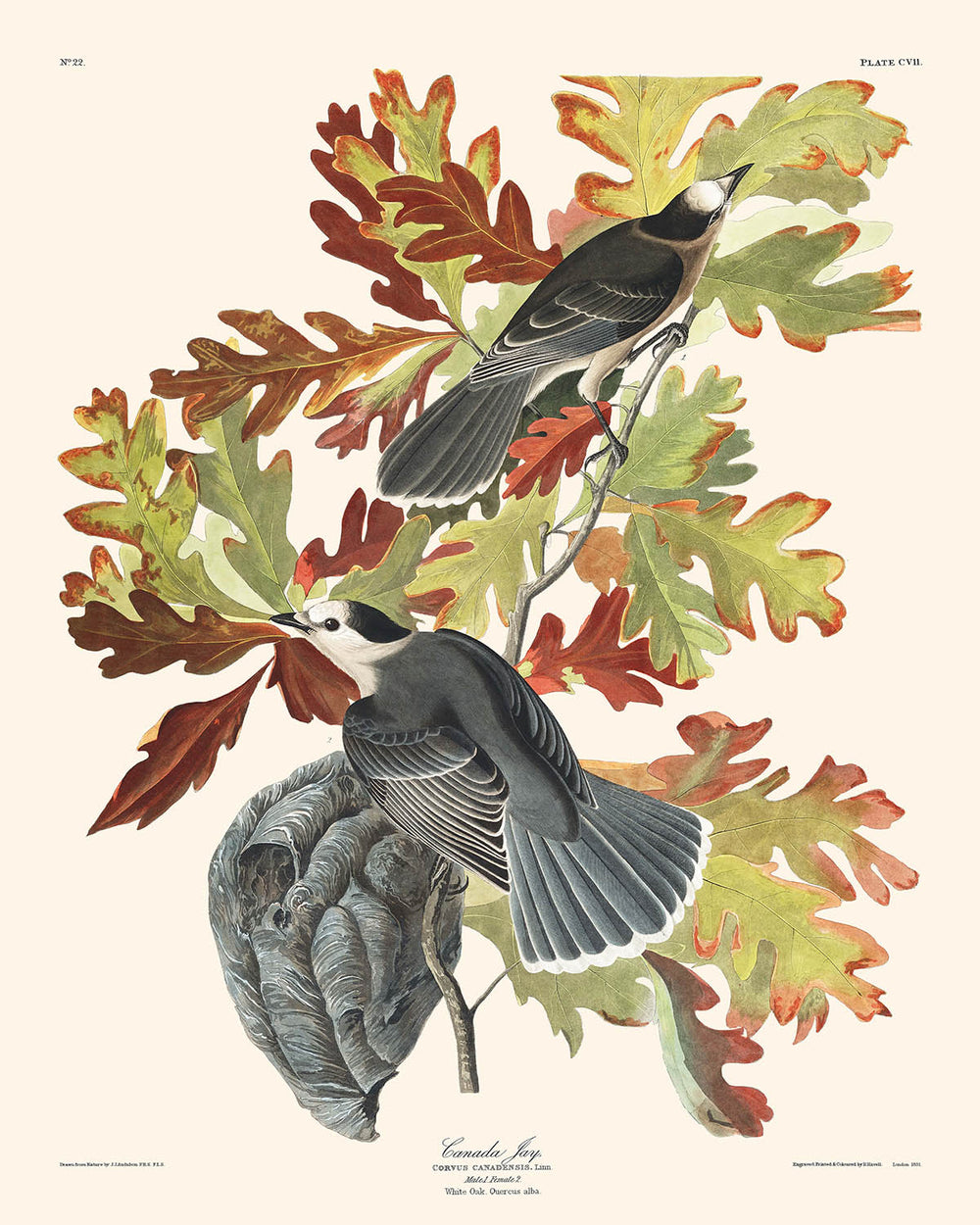 La presenza dinamica del Canada Jay, la sua natura impavida e i comportamenti interessanti, come descritti da Audubon, rendono questa stampa un'aggiunta inestimabile a qualsiasi casa. La tendenza dell'uccello a interagire audacemente con gli esseri umani, avventurandosi anche nei loro accampamenti, aggiunge un ulteriore strato di fascino e curiosità a questa illustrazione. Lo sfondo dettagliato, con foglie di quercia autunnali, aggiunge un tocco di colore e stagionalità, migliorando la qualità artigianale della stampa.