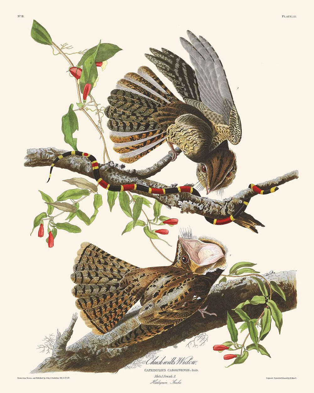 Il Chuck-will's Widow è particolarmente notevole per il suo comportamento affascinante e il suo habitat unico, spesso trovato nelle profonde gole e paludi del sud-est degli Stati Uniti. Scientificamente conosciuto come Caprimulgus Carolinensis, i richiami inquietanti di questo uccello echeggiano nei boschi al crepuscolo, aggiungendo una qualità misteriosa ma calmante all'ambiente circostante. Questa stampa cattura una scena notturna serena in cui gli uccelli interagiscono con un innocuo serpente arlecchino su un ramo in decomposizione, evidenziando la rappresentazione dinamica della fauna selvatica da parte di Audubon.